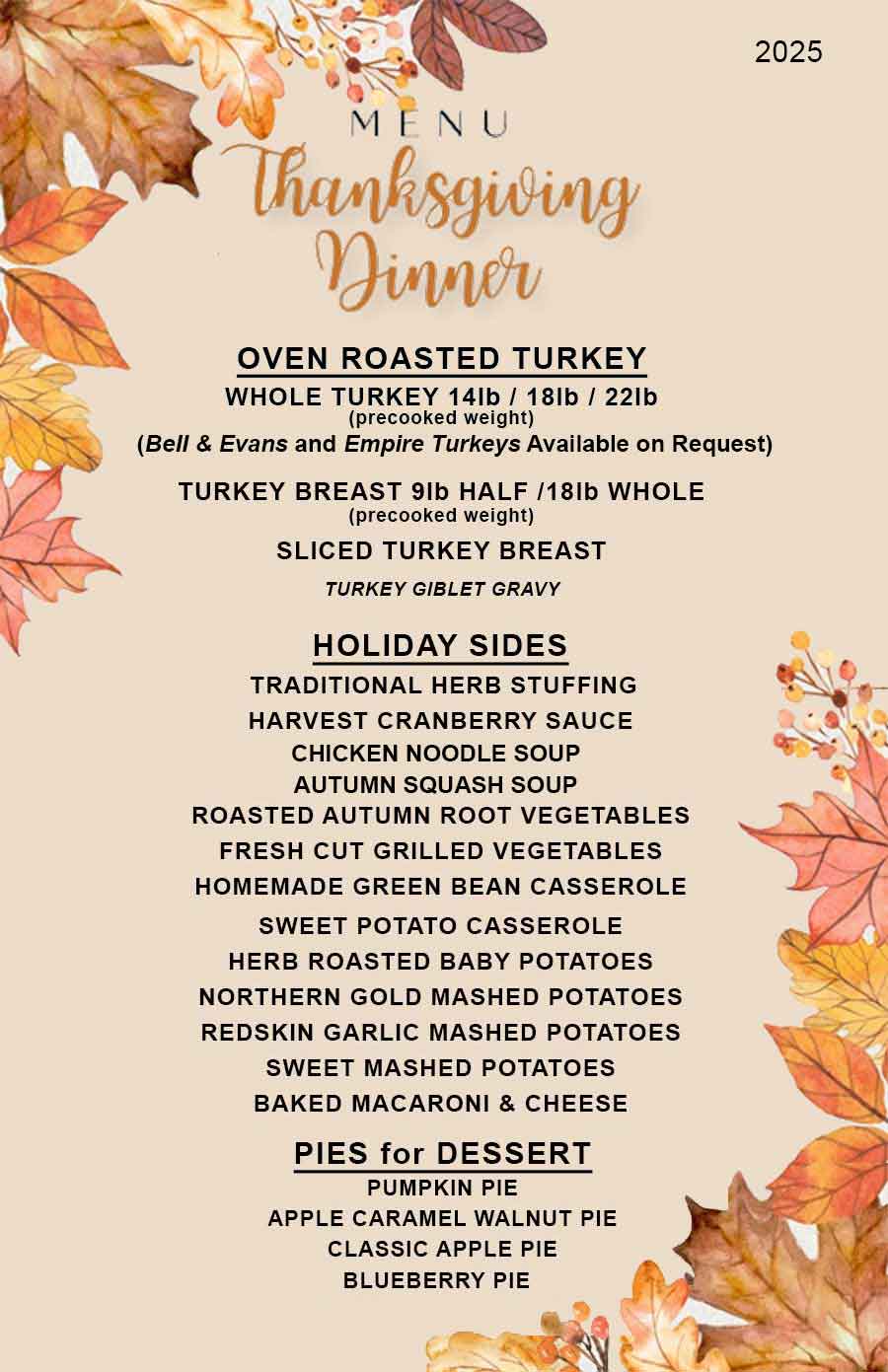 Our Thanksgiving Day menu is available online and throughout the store. Call our deli catering department at 609-823-2741 to place your order.
